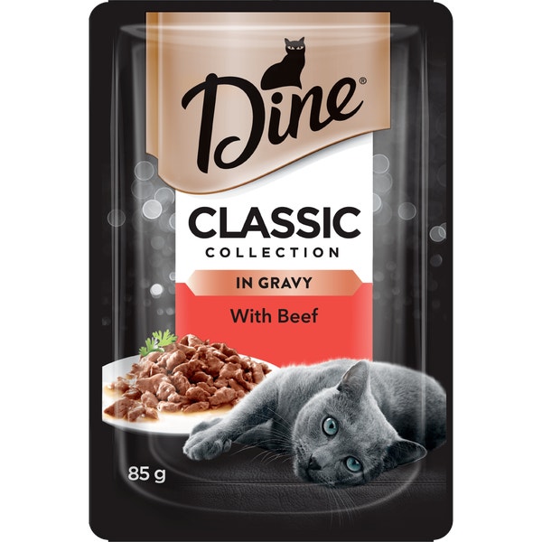 Introducing DINE® Classic Collection. A classic medley of tender pieces of beef, served in a delectable sauce. At DINE® we understand your feline friend's desire for high quality cat food and well-crafted recipes. DINE® has designed a collection of superior cat food and cat treats, with delicious recipes, making feeding your cat a pleasure every time.